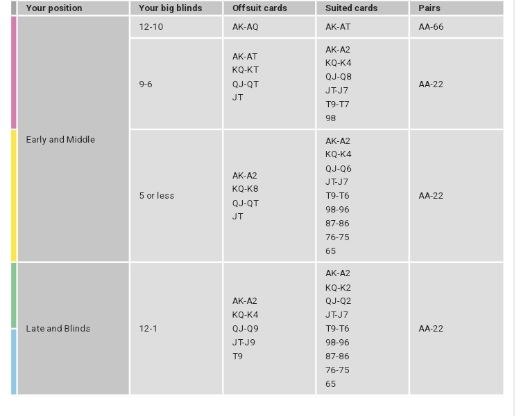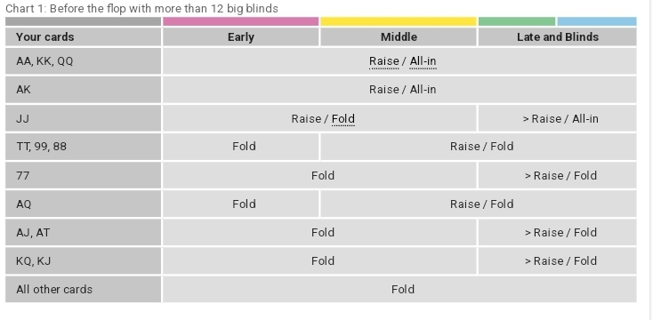 Si votre tapis est supérieur à 12 fois la grosse blind, il est plus important de protéger vos jetons que de prendre un risque. Ne pas perdre de jetons est plus important que d'en gagner. Nos experts en poker ont élaboré un tableau qui vous indique exactement quel est le meilleur jeu à adopter lorsque vous recevez vos deux cartes au début d'un nouveau tour.