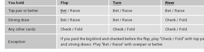 La seule situation où vous voyez un flop sans être all-in est lorsque vous avez payé la grosse blind et checké avant le flop. Dans ce cas, vous jouez "Bet / Raise" comme vous l'avez appris auparavant avec une paire supérieure ou mieux et tout tirage fort. Vous jouez "Check / Fold" avec toutes les autres cartes.