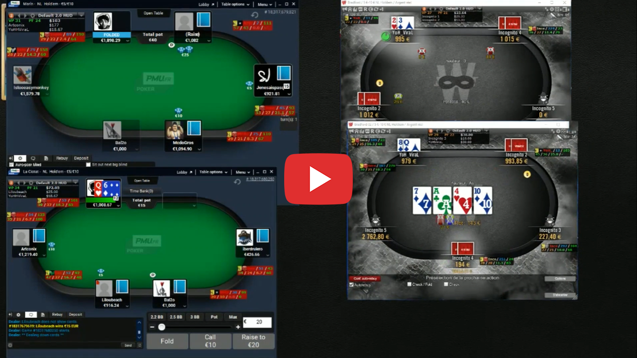 Cette semaine, YoH ViraL commencera par te montrer comment jouer sur les rooms françaises en cash game highstakes puis continuera en t'expliquant comment jouer avec une image dégueulasse et clôturera par une session MTT sur des Wina Series et Turbos. Sirflo, lui te permettra d'exploiter les regs fishs en casino et te présentera des mains de Wahid, gros gagnants en live. Thibaut sera en plein challenge de montée de limite avec la NL5 et Willmaxx sera en review de Sit and Go à 1€.
